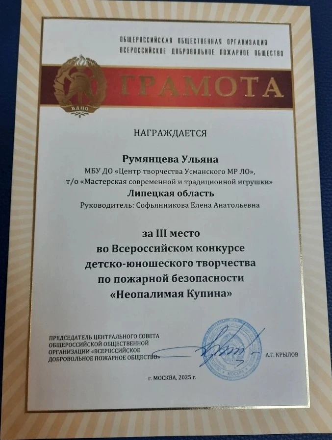 Призером конкурса в номинации «Декоративно-прикладное творчество» стала Румянцева Ульяна, учащаяся объединения «Мастерская современной и традиционной игрушки» Центра творчества г. Усмани (руководитель Софьянникова Е.А.).